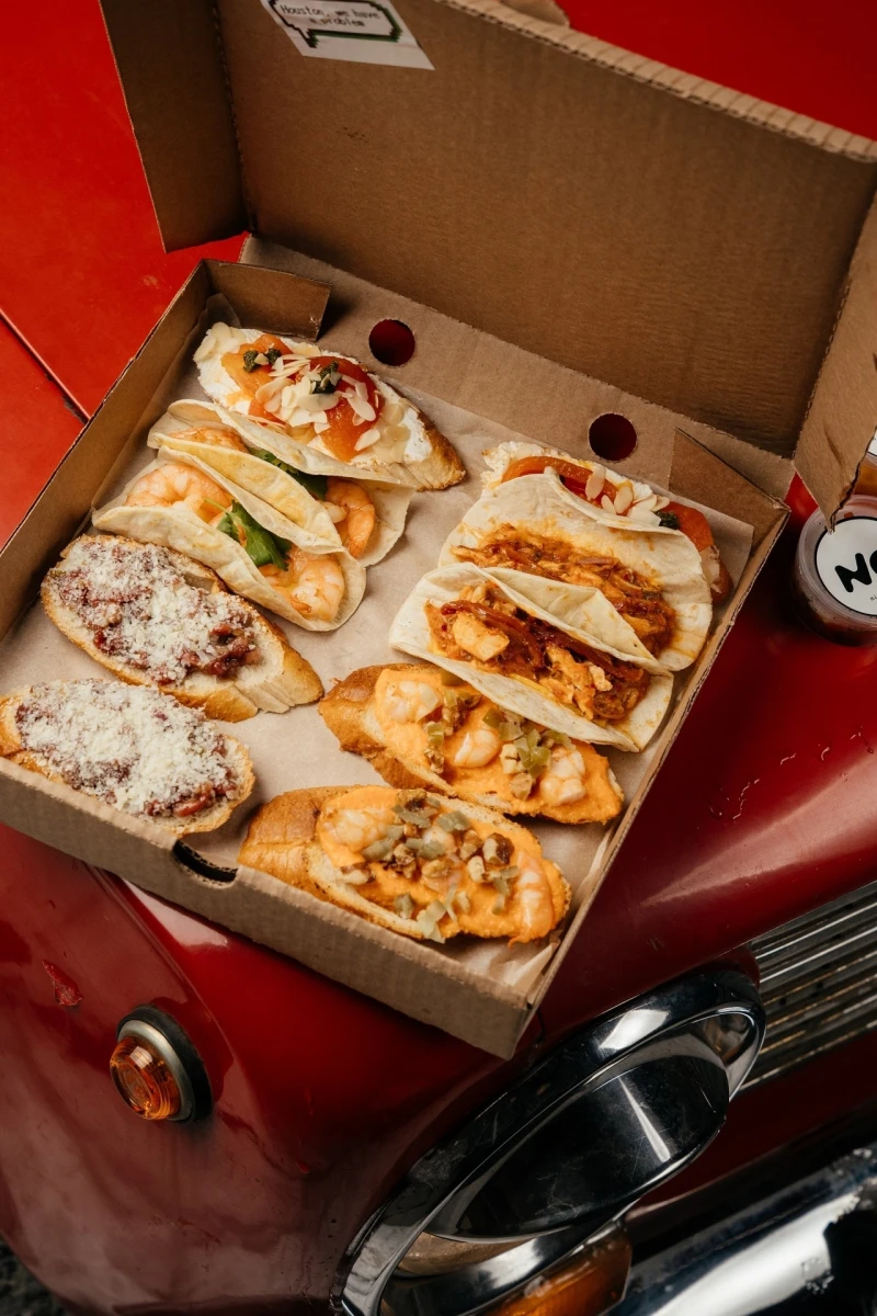 Брускетта с тар- таром 2шт / Брускетта с Креветкой 2 шт / Брускетта с чили томатами и песто 2 шт / Тако с креветкой и манго 2шт / Тако с рваной свининой 2 шт